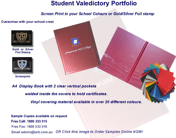 Student Valedictory Portfolio Description Contact us for a quote on your specific needs. Sample copies available on request. Free Call: 1800 333 515 Email: admin@tarb.com.au OR click here for a Quote or to Order Samples online now. Related products Graduation Certificate Holder Diploma Style Student Presentation Portfolio Promotional Manila Folder Graduation Certificate Holder Double Page