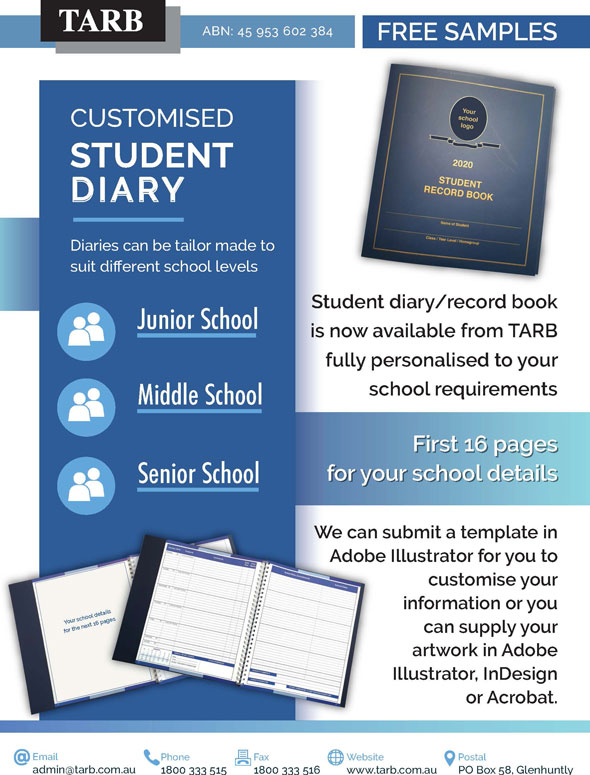 Customised Student Diary Description Contact us for a quote on your specific needs. Sample copies available on request. Free Call: 1800 333 515 Email: admin@tarb.com.au OR click here for a Quote or to Order Samples online now. Related products Graduation Certificate Holder Diploma Style Graduation Certificate Holder Double Page Student Valedictory Portfolio Student Presentation Portfolio
