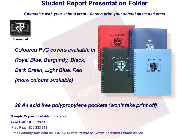 Student Report Presentation Folder Description Contact us for a quote on your specific needs. Sample copies available on request. Free Call: 1800 333 515 Email: admin@tarb.com.au OR click here for a Quote or to Order Samples online now. Related products Customised Student Diary Graduation Certificate Holder Diploma Style Student Presentation Portfolio Graduation Certificate Holder Double Page